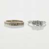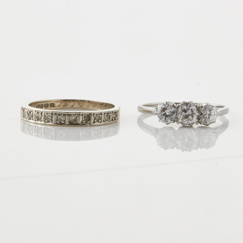 claw set with three graduated round cut diamonds, to a plain white metal shank; together with an 18ct gold diamond set half eternity ring (2)