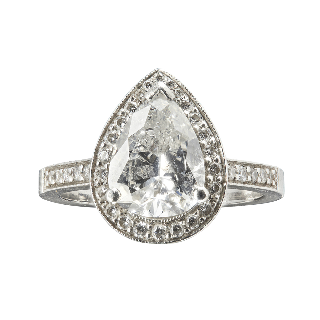 claw set with a pear shaped diamond in a single border of small round brilliant cut diamonds, each shoulder set with six small round brilliant cut diamonds, further diamond detail to underside of gallery, to a plain shank