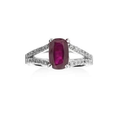 claw set with an oval cut ruby, the split shoulders set with small round cut diamonds, to a plain platinum shank