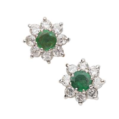 each set with a round cut emerald in a single border of round brilliant cut diamonds, to post and butterfly fittings, unmarked