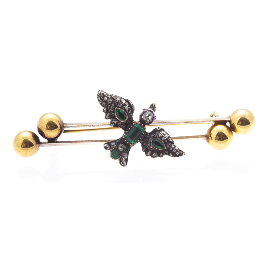modelled with wings spanned, the central body with a collet set emerald, set to a unmarked yellow metal bar brooch with two ball terminals