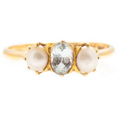 claw set with an oval cut aquamarine, flanked to either side by two bouton pearls, to a plain yellow metal shank stamped 18k