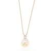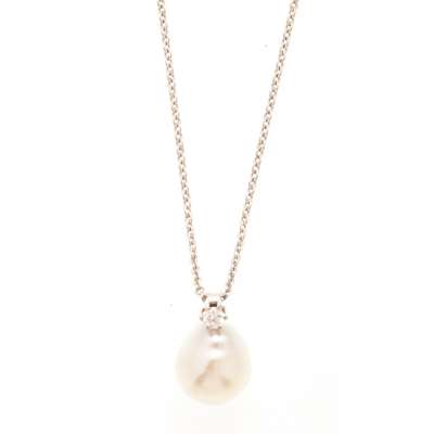 claw set with a small round cut diamond above a drop shaped pearl, to a plain white metal belcher link chain, stamped 585