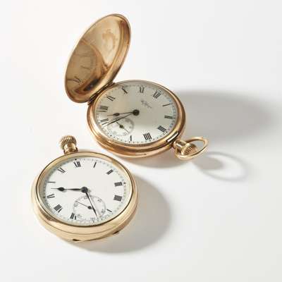 the first keyless wind, open faced, white dial, Roman numerals subsidiary seconds dial, with a hunter cased pocket watch, keyless wind, plain cases, white dial with Roman numerals, subsidiary seconds dial