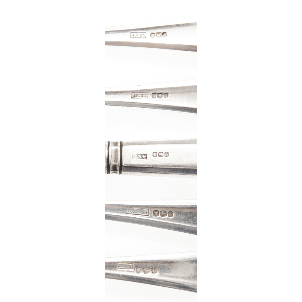 J B Chatterly and Sons, Sheffield 1971 and 1972, comprising six soup spoons, six dessert spoons, six table forks, five dessert forks and twelve knives with steel blades (Qty)