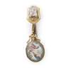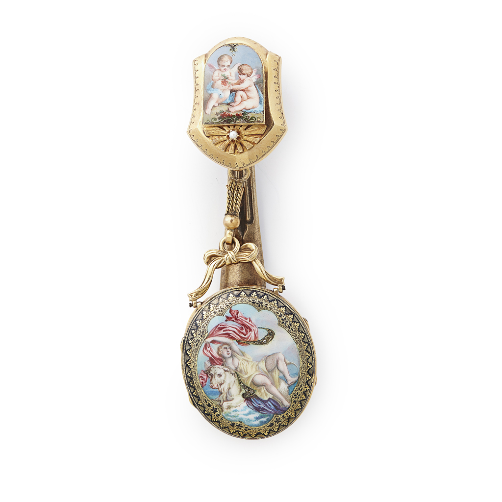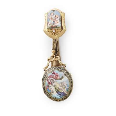 the oval enamel case decorated with Europa and the bull, tiny diamond detail, the rear engraved with initial 'R', black enamel border, the hinged cover enclosing a Swiss movement signed A Frankfeld, Geneve, numbered 11188, together with a similar period gilt and enamel clip with suspension, the shaped panel with enamel of putto, set pearl below