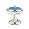 Birmingham 1923, of circular outline raised on a tapered foot, the pull off lid with blue enamel detail with mirror to underside, gilt lined