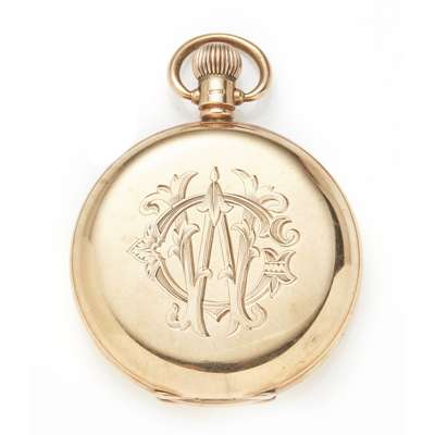 keyless wind lever movement, full hunting case, engraved monogram, white dial, Roman numerals, subsidiary seconds dial