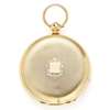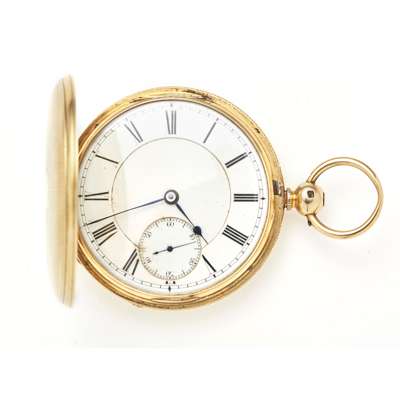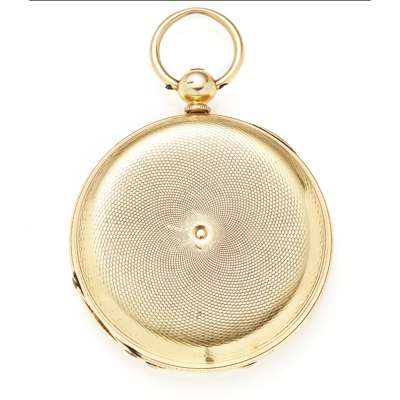 the case with engine turned decoration, blank cartouches, key wind English lever movement, white enamel dial with Roman numerals, subsidiary seconds dial