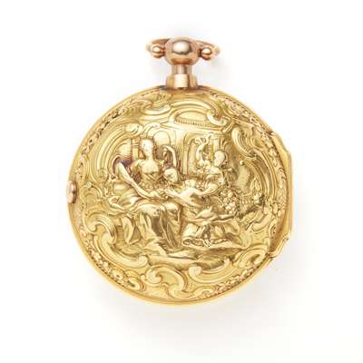 the case London circa 1750, the outer case with bold decoration of ladies in an interior within C scrolls and foliate border, the inner cover enclosing a later movement by J&W Howden of Edinburgh, gilt dial, movement numbered 2098
