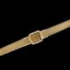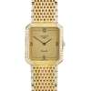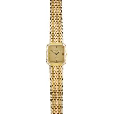 the square satin gilt dial with polished gilt Roman numerals, marked quartz, diamond set part bezel and onto the integral rounded linked bracelet, Longines fold over clasp, serial no. 20872320