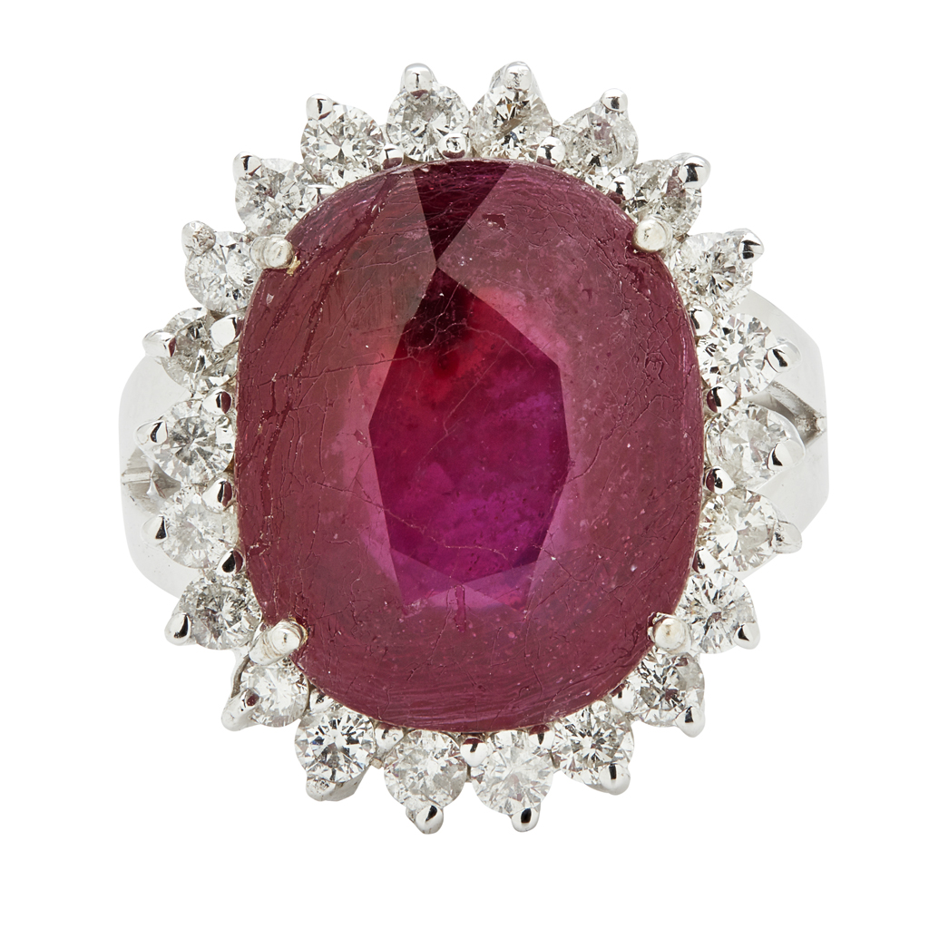 Ring size: M/O, estimated total gem weights: ruby 8.38cts, diamonds 0.66cts