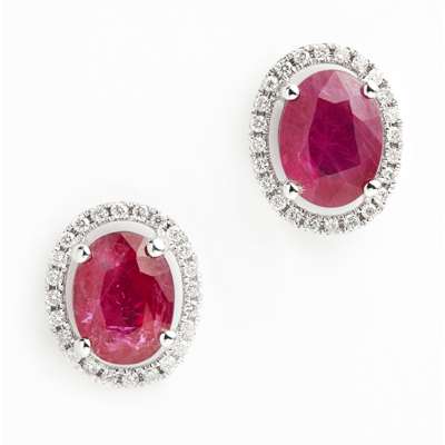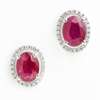 each claw set with an oval cut ruby, in an open border of small round brilliant cut diamonds, to post and butterfly fittings, stamped 750
