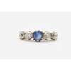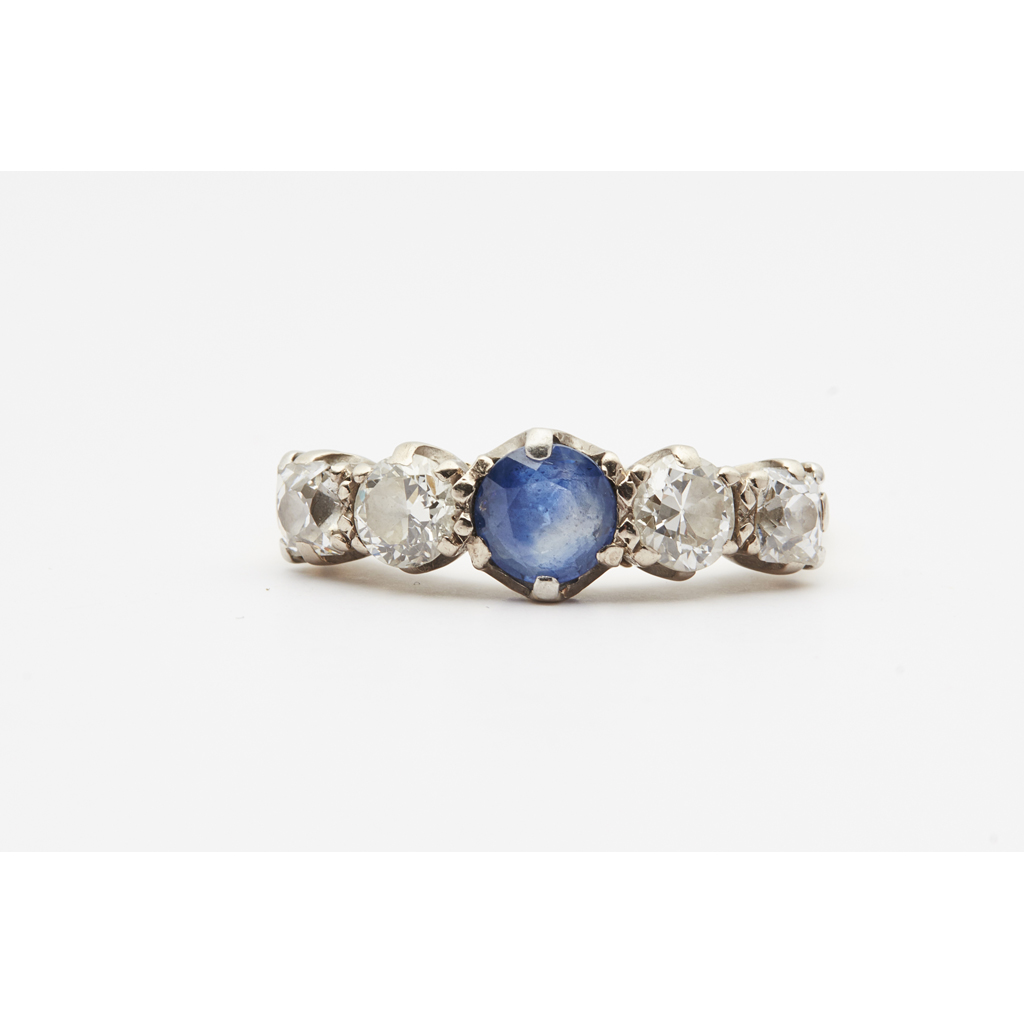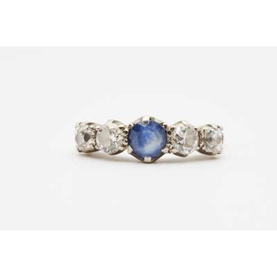 claw set with a round cut sapphire, flanked to either side by a round cut and a cushion cut diamond, to a plain yellow metal shank stamped 18ct