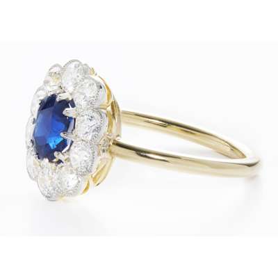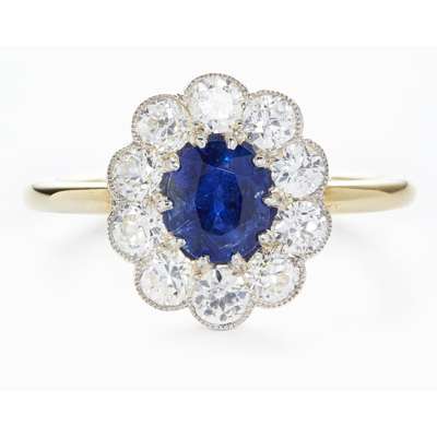 claw set with a cushion cut sapphire, in a single border of small round brilliant cut diamonds, to a plain shank, stamped 750; with accompanying report by Gemmological Certification Services, dated 13.01.16, numbered 5776-4202, stating that the sapphire is natural and shows no indications of heat treatment