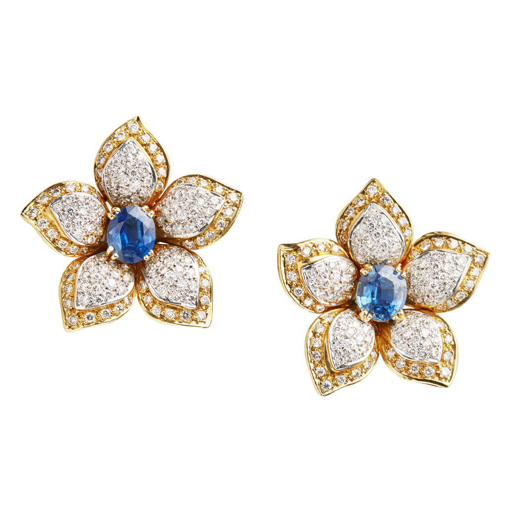 each claw set with an oval cut sapphire, the bi-metal surround pavé set throughout with small round brilliant cut diamonds, to clip fittings, stamped 750