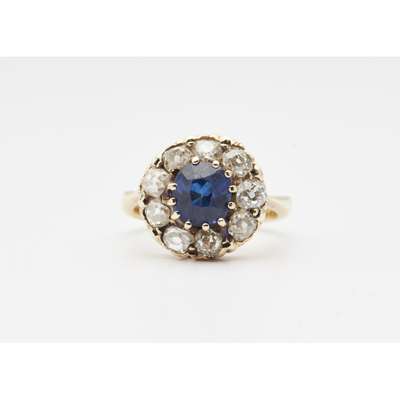 claw set with a cushion cut sapphire in a border of old round cut diamonds to a pierced gallery and a yellow metal shank, stamped 18ct