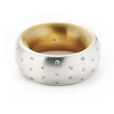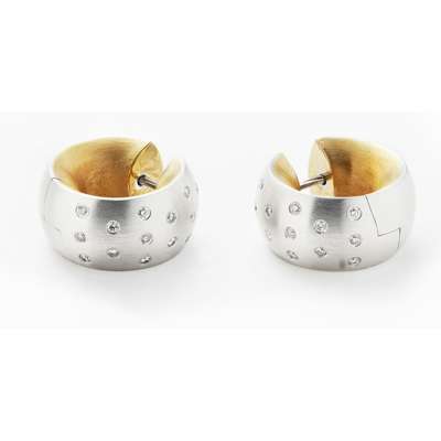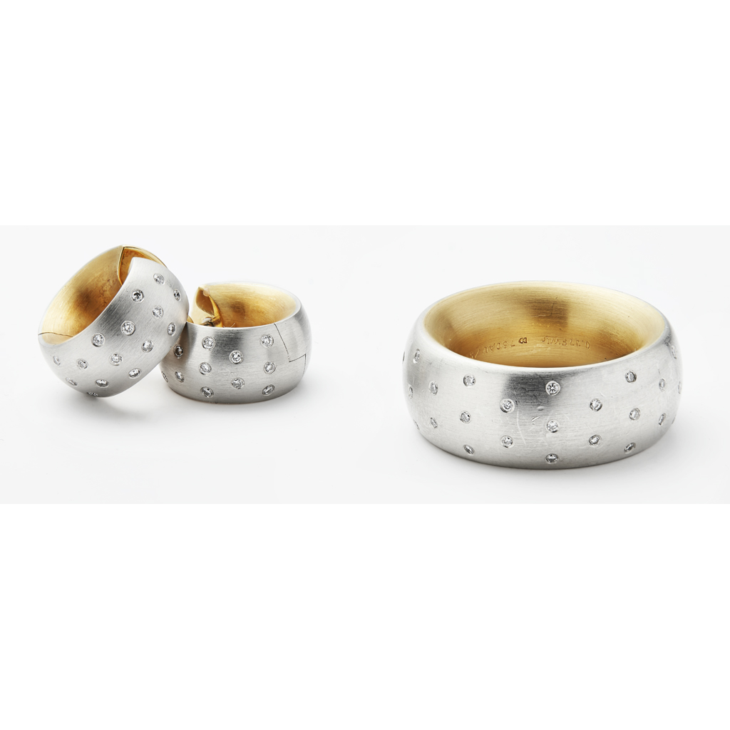 of broad design, the brushed metal band set throughout with small round cut diamonds; together with a pair of matching hoop earrings, of hinged design, each set throughout with small round cut diamonds (2)
