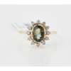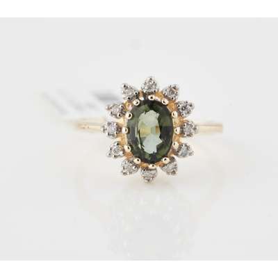 claw set with an oval green tourmaline, in a single border of claw set round cut diamonds, to a plain yellow metal shank stamped 10K