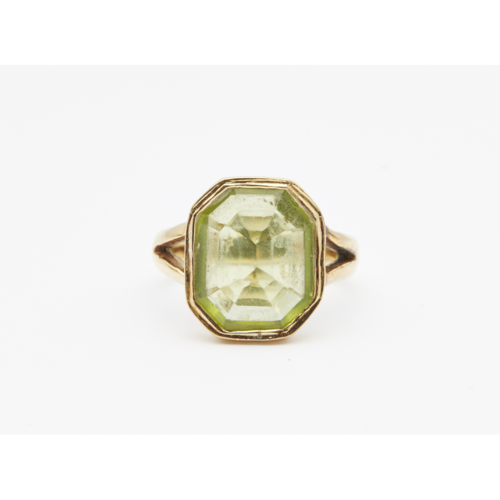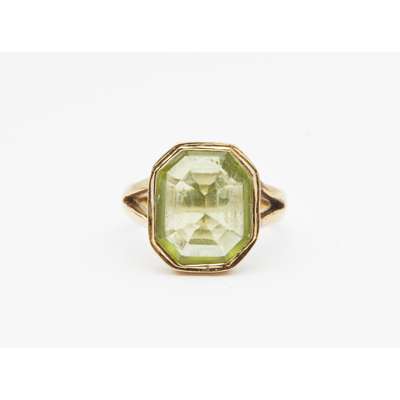collet set with a trap cut peridot, to a plain yellow metal shank with indistinct marks