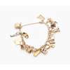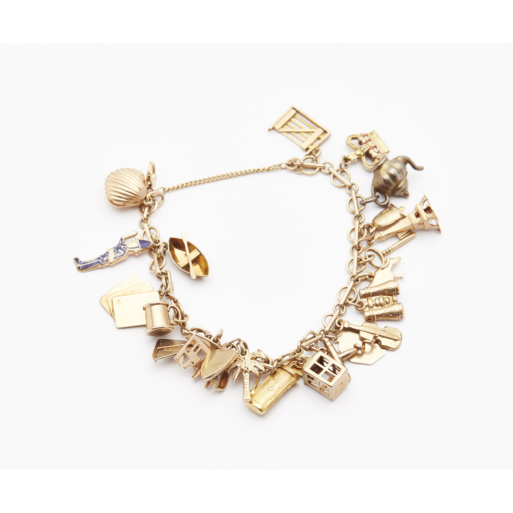 composed of circular links, suspending various charms including the Eiffel Tower, a palm tree and a clam with seed pearl