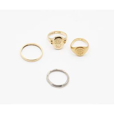 of traditional design with engraved initials; together with an 18ct gold band, an unmarked yellow metal signet ring and a white metal band stamped PLAT (4)