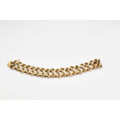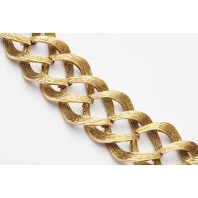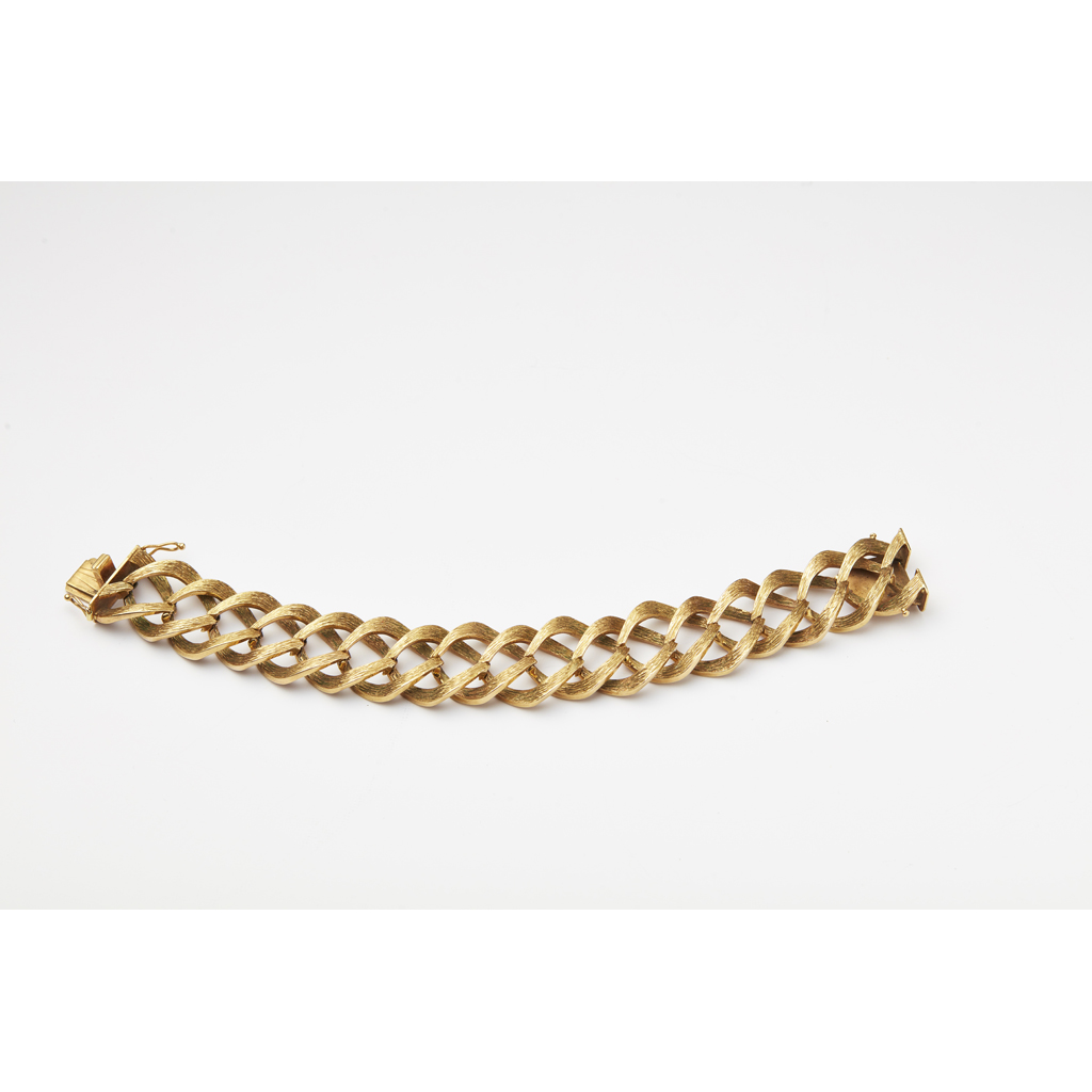 composed of interwoven textured loops to a concealed clasp and safety catch, stamped 9ct