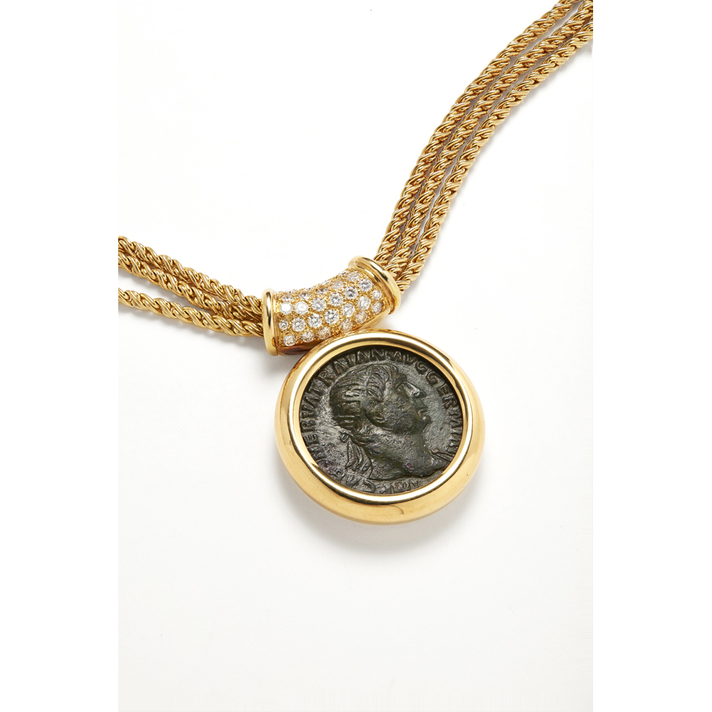 collet set with a Roman Dupondio, below a curved bale pavé set with graduated small round cut diamonds, to a triple strand rope-twist necklace and ribbed clasp, stamped 750