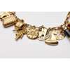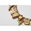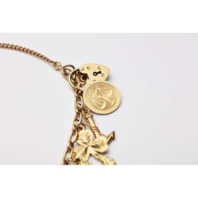 composed of belcher links with a padlock clasp, suspending various charms including a teapot, wishbone and an anchor, among others