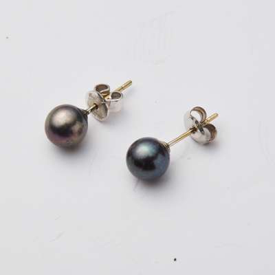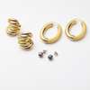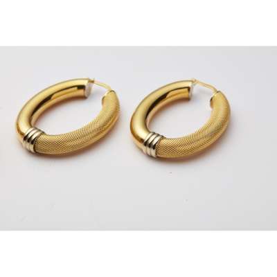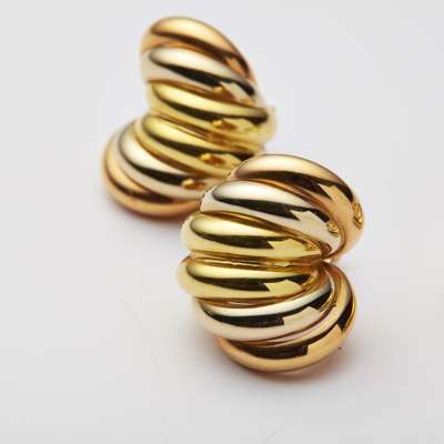 the first of three colours, scrolling curved form, to post and clip fittings, the other pair of hoop form, half textured half polished detail; with a pair of cultured pearl earrings (3)