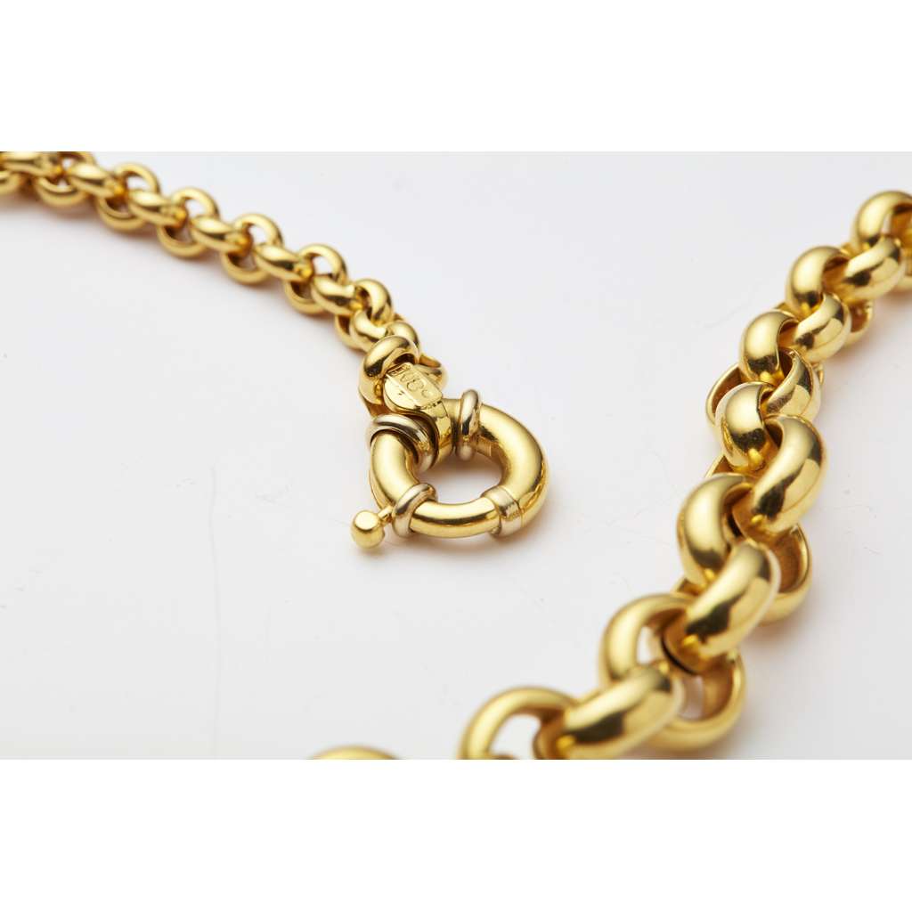 the bracelet of plain bold belcher links, the necklace of similar but graduated links, sprung circular catches, stamped 750 (2)
