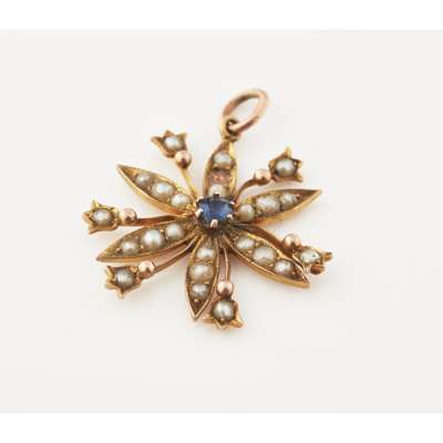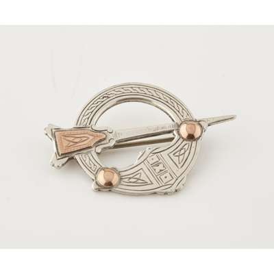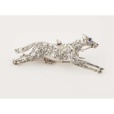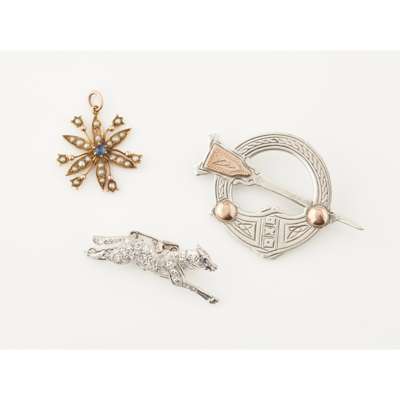 modelled in white metal as a galloping horse, pavé set body with eight cut diamonds, sapphire eye; a small seed pearl set star brooch: an Irish silver brooch modelled as Tara Trinity knot style (3)