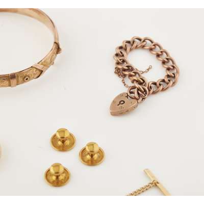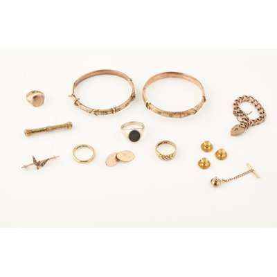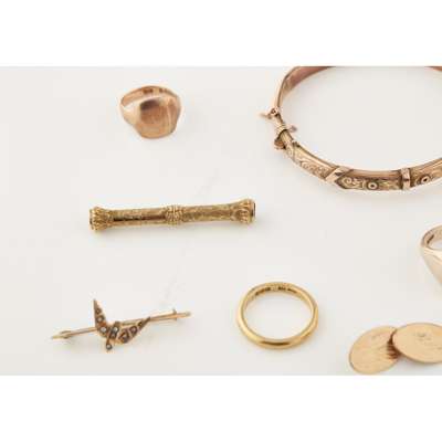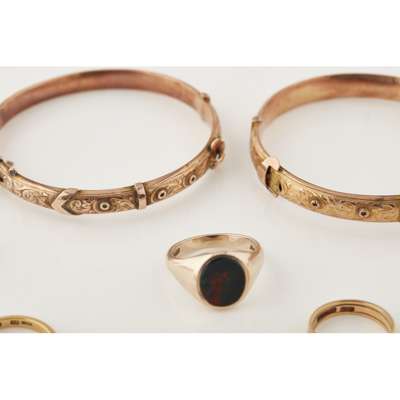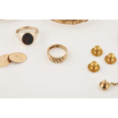 to include; an 18ct gold wedding band; a gold twist ring; a 9ct gold ring set bloodstone; a group of three studs, a cufflink; two gold bangles; small gold part bracelet; a plated tie tack