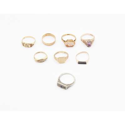 to include an early 20th century sapphire and diamond set ring (one diamond deficient) with filigree detail; a 18ct gold wedding band, a 9ct gold signet ring; two 18ct gold and diamond set rings, two 9ct gold gem set rings; a cameo set ring (8)