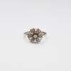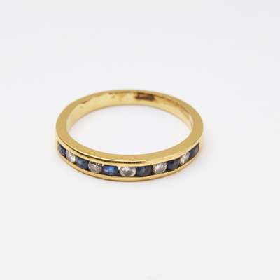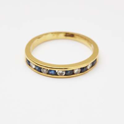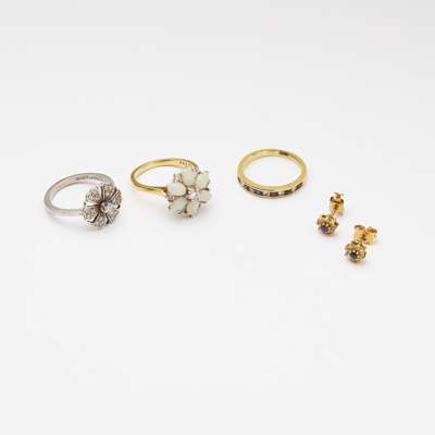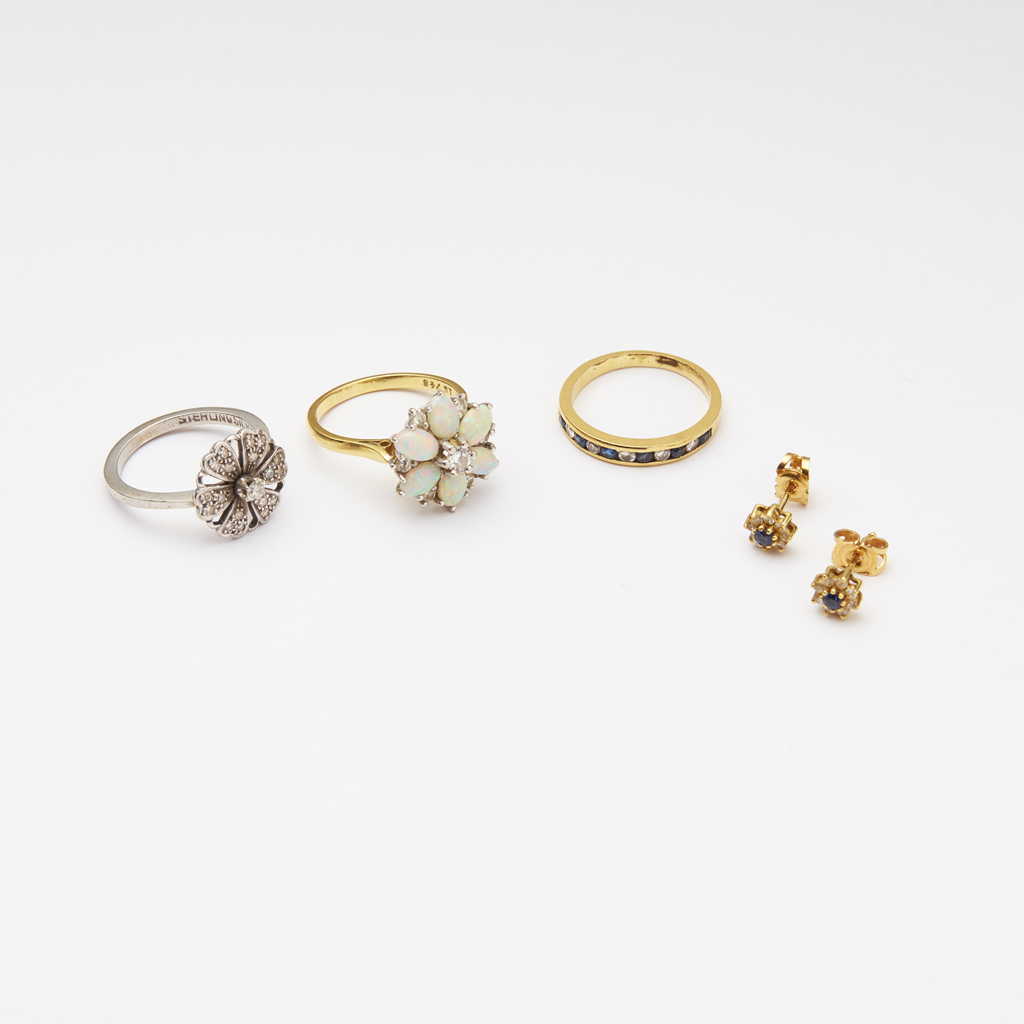 each claw set with a round cut sapphire in a border of small round cut diamonds, to post and butterfly fittings; together with an 18ct gold opal and diamond set cluster ring, a sapphire and diamond set half-eternity ring and a diamond set cluster ring (4)