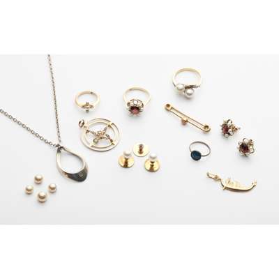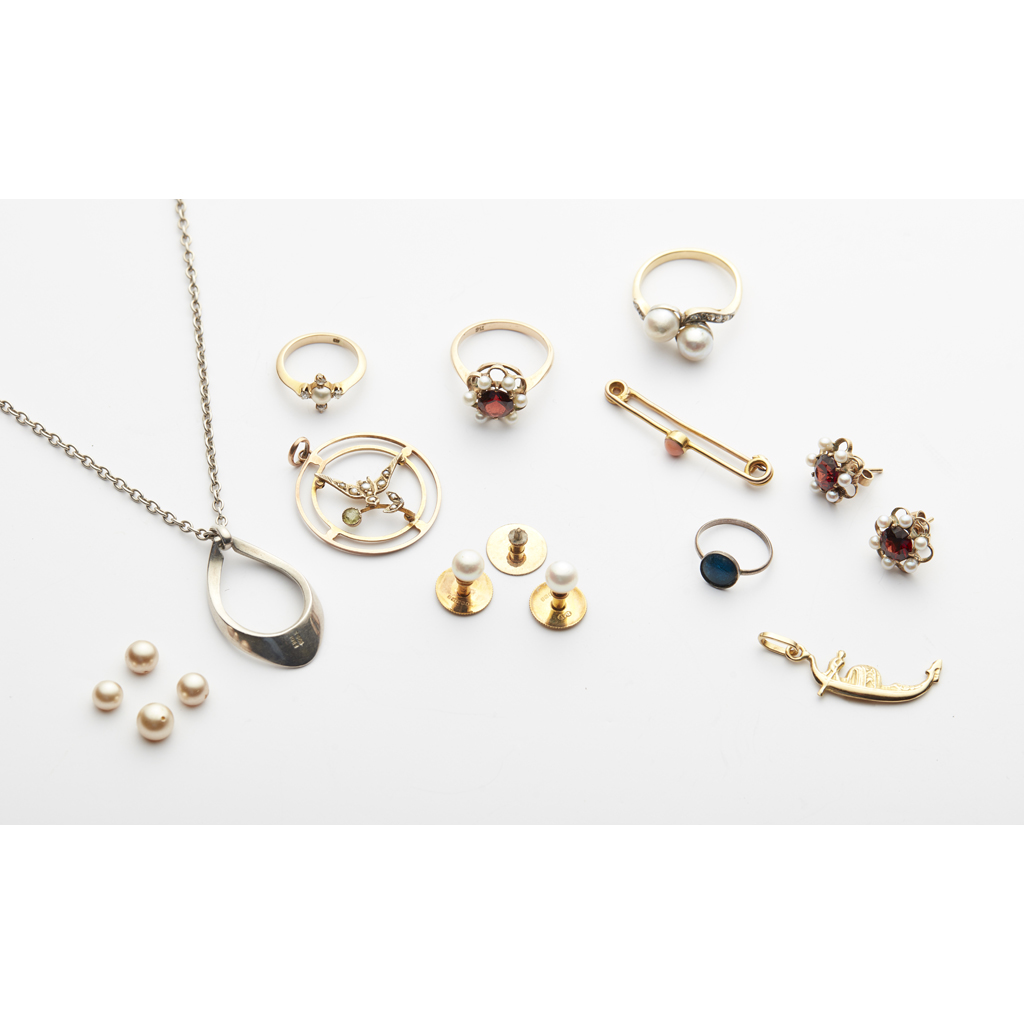 to include a cultured pearl and diamond set cross over ring, a garnet and seed pearl set cluster ring and matching earrings, a seed pearl and peridot set pendant, a contemporary silver pendant necklace, various other brooches, pendants, rings and studs (qty)