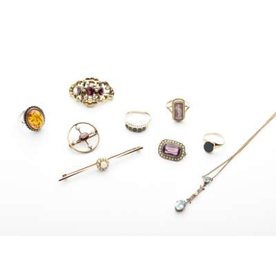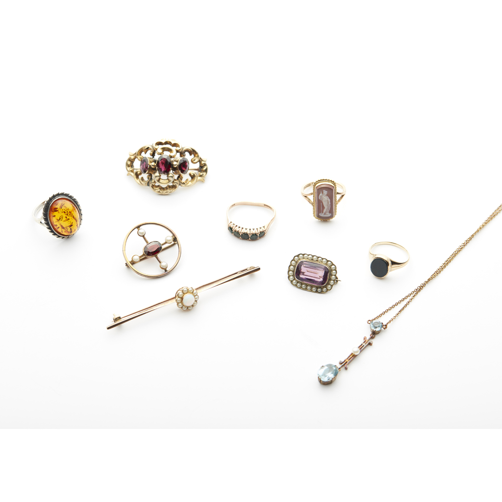 to include an aquamarine and seed pearl set pendant necklace, an opal and seed pearl set bar brooch, a seed pearl and amethyst set brooch; two garnet set brooches, a cameo ring, three other gem set rings (qty)