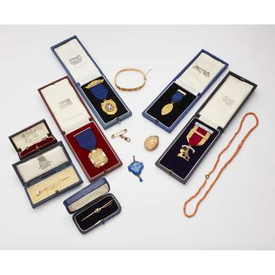 to include a small 9ct gold ruby and diamond set bangle, four presentation medals relating to various Glasgow based trade industries; a pearl set stick pin, a graduated coral bead necklace and various other pendants, brooches etc (qty)