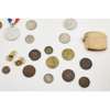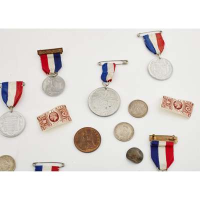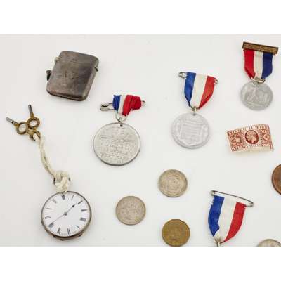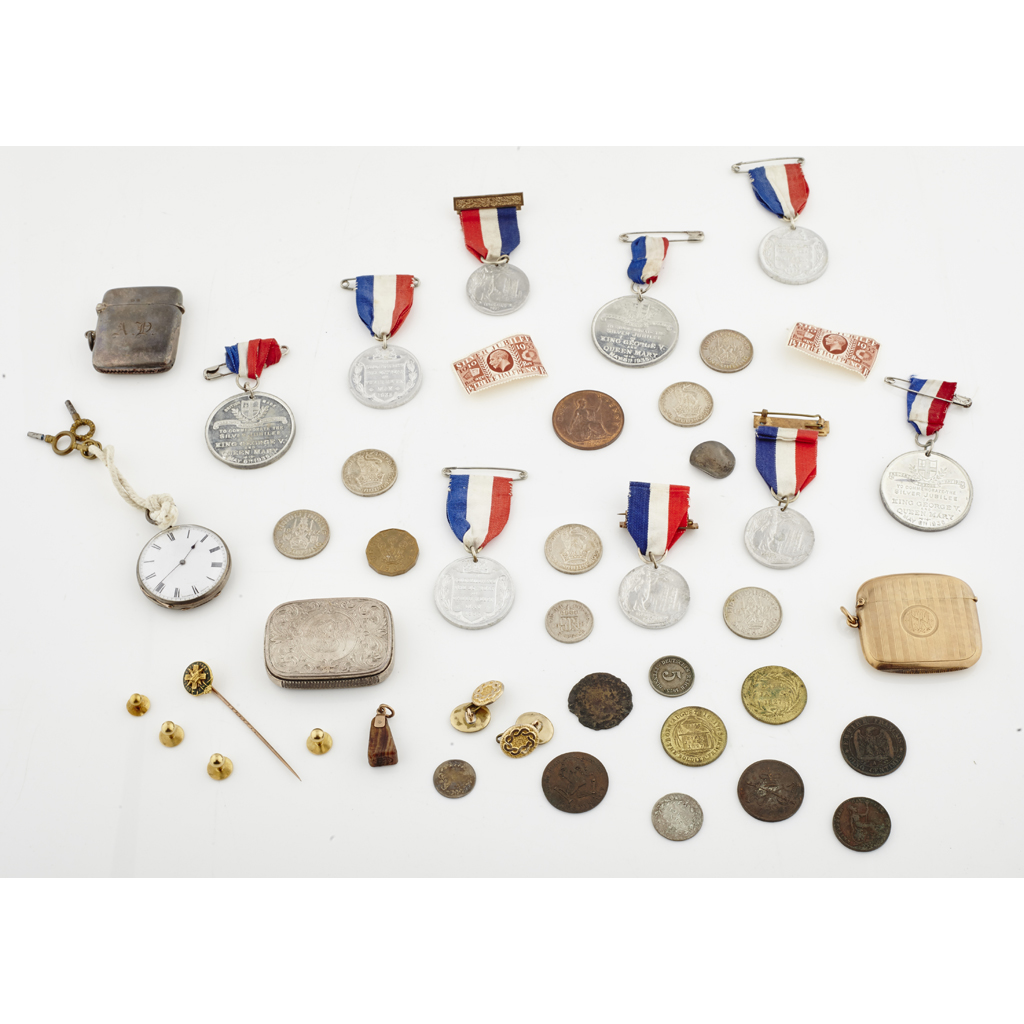a pair of engraved and chased cufflinks; a leather case for studs and stick pins, four studs; a silver and a 9ct gold vesta case; silver cased small pocket watch; miscellaneous coins; a Victorian silver vesta case, London 1895, of rounded rectangular form, engraved monogram, hidden opening; three 1910-35 silver jubilee presentation boxes with various contemporary Jubilee medals, coins and stamps