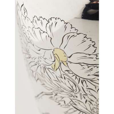 of tapered shoulders form with engraved sprays of chrysanthemums and foliate, gold inlaid highlights, three character signature to body and four character mark to base