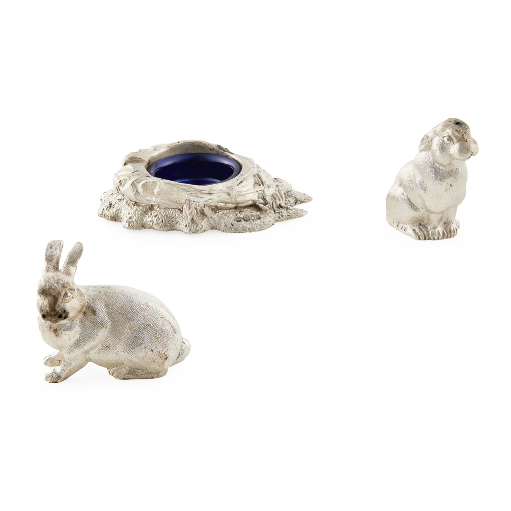 RC, 1990 the salt and pepperette modelled as two seated rabbits, mustard dish formed as a pond with blue glass insert, all naturalistically decorated (3)