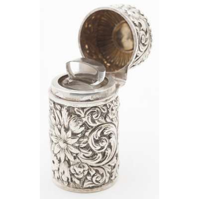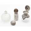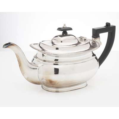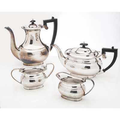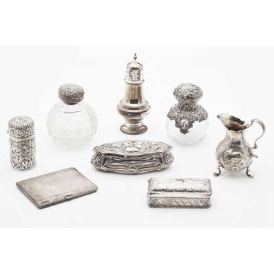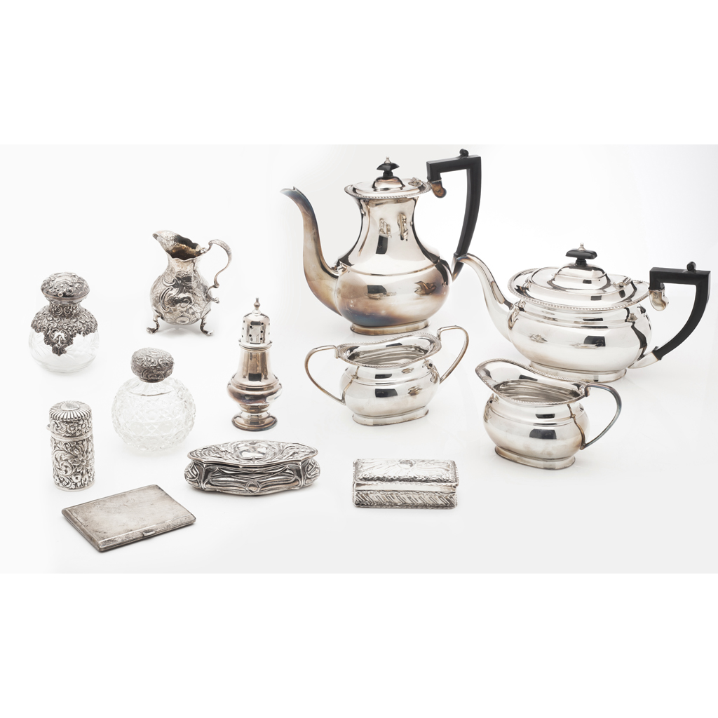 Parkin Silversmiths Ltd, Sheffield 1978, comprising coffee pot, tea pot, twin handled sugar and cream jug, of baluster form, reeded detail, simple angular handles and raised thumb piece together with two silver mounted glass dressing table bottles; an embossed vanity bottle, Goldsmiths 1889; together with two dressing table boxes, a cigarette case, S Blanckensee & Sons Ltd Birmingham, 1937, a caster and a milk jug (12)