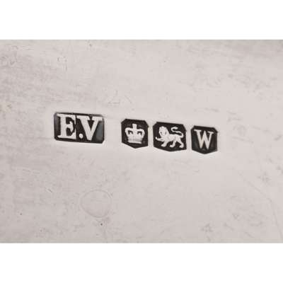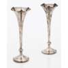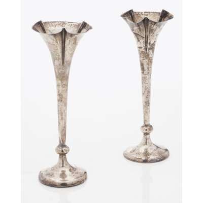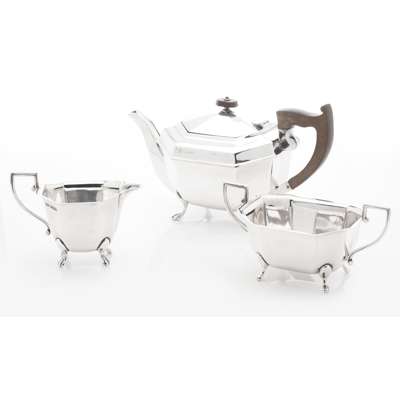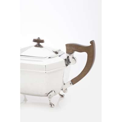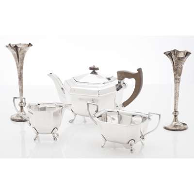 Viner's Ltd, Sheffield 1939, comprising, teapot, two handled sugar bowl, milk jug, all of canted form, angular handles raised on four paw feet; together with two spill vases, C.H, Birmingham 1905 (5)