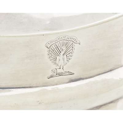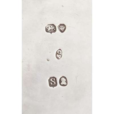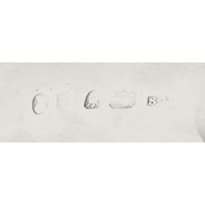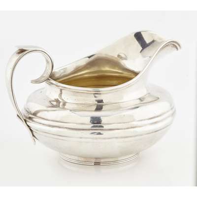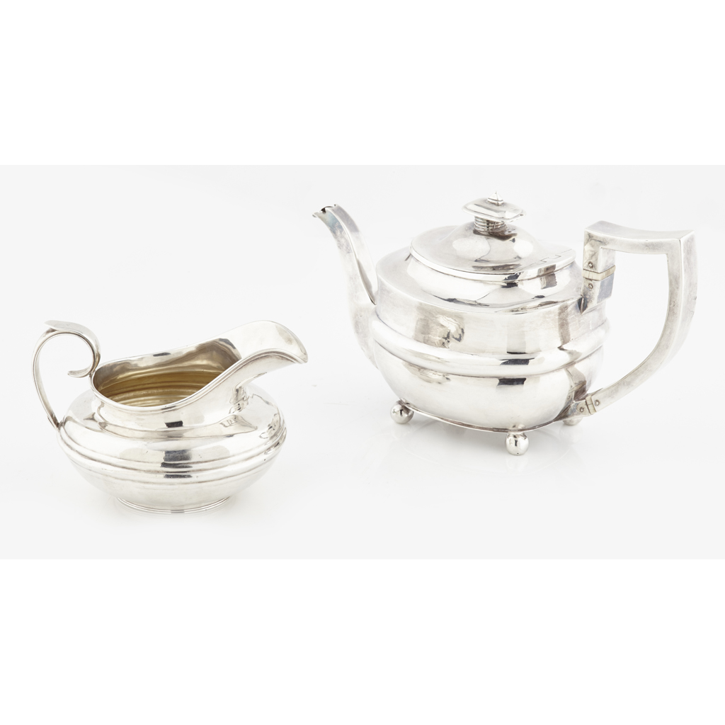 Marks rubbed circa 1790, of rounded rectangular form engraved crest, plain angular handle and raised on ball feet, with a later Victorian cream jug, SF, London 1870 of squat circular form, pedestal foot (2)