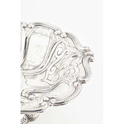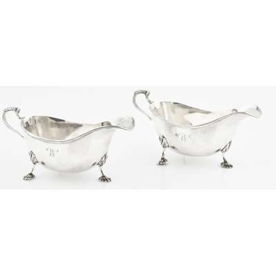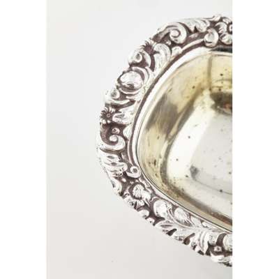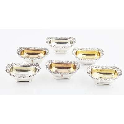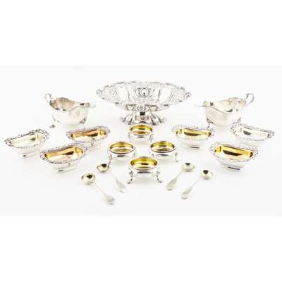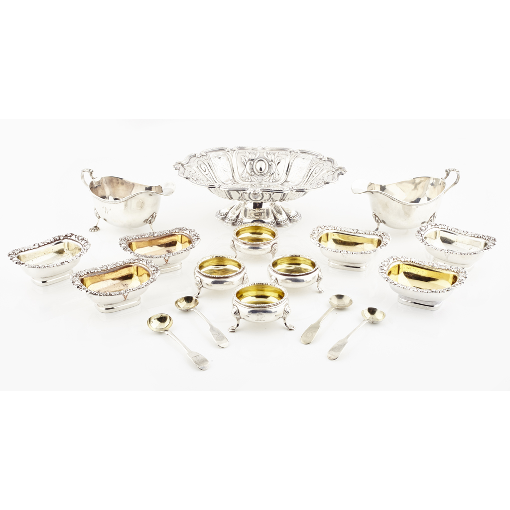 to include; a bon bon dish, London 1900, raised on a pedestal, moulded border, pierced detail; together with a pair of sauce boats, Synyer & Beddoes, Birmingham 1936; a collection of four cauldron salts various dates and marks; a set a six plated salt cellars (qty)