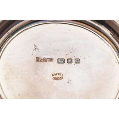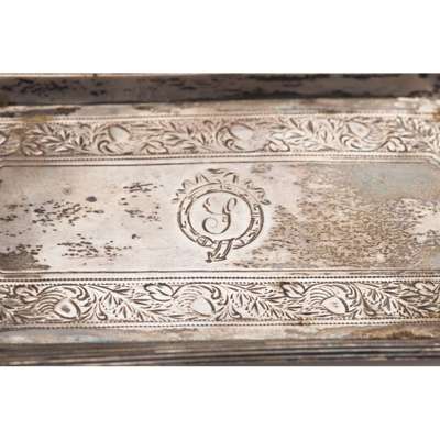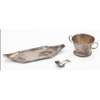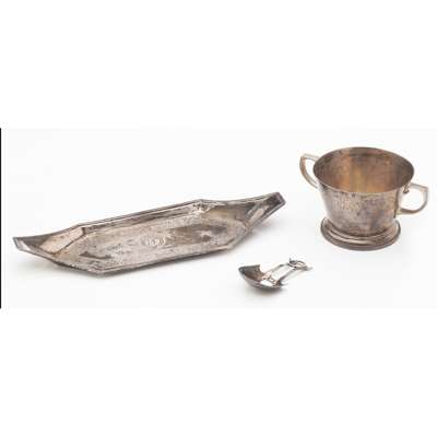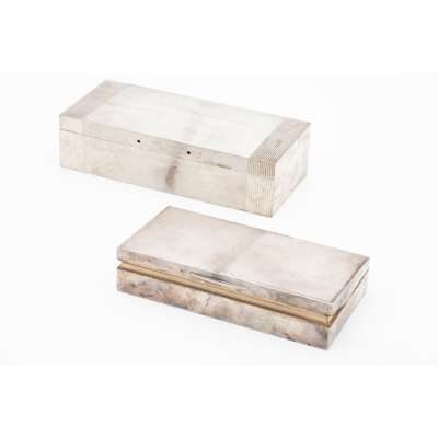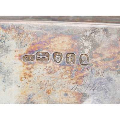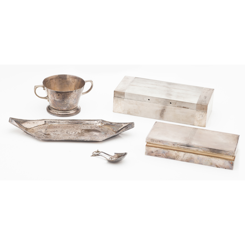 Asprey & Co, 1936, of traditional form, angular handles, stepped foot, engraved border detailing the coronation of King George VI; together with a caddy spoon, a silver tray, Henry Chawner, 1794 of octagonal form, engraved border and inscription to centre; two cigarette boxes Birmingham 1928 and London, 1936 both with engine turned detail to lids (5)