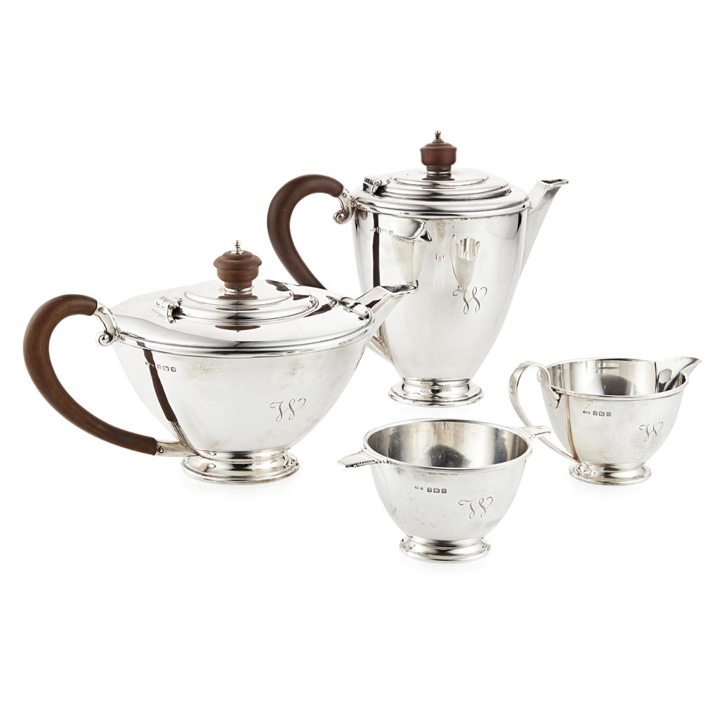 Henry Clifford Davis, Sheffield mid-1930s, comprising a water pot, teapot, milk jug, twin handled sugar bowl each of simple tapered form, stepped foot and lid with scroll handle and finial, all with W engraved to front (4)