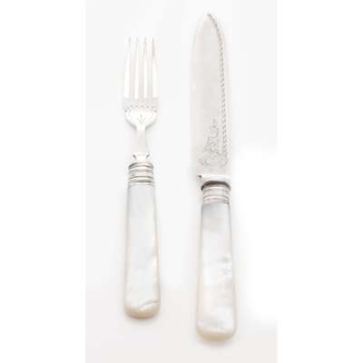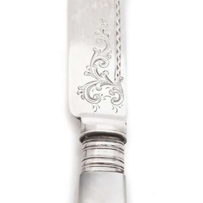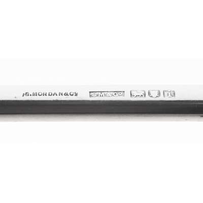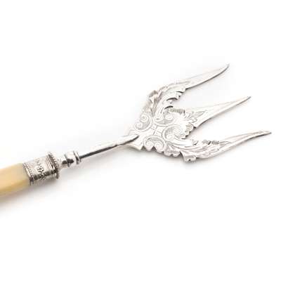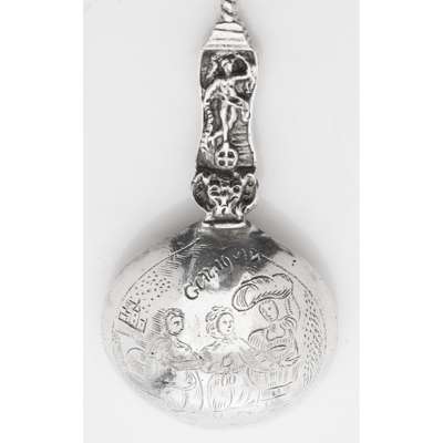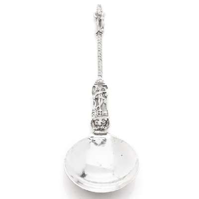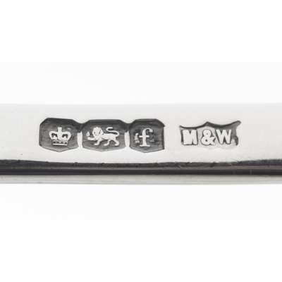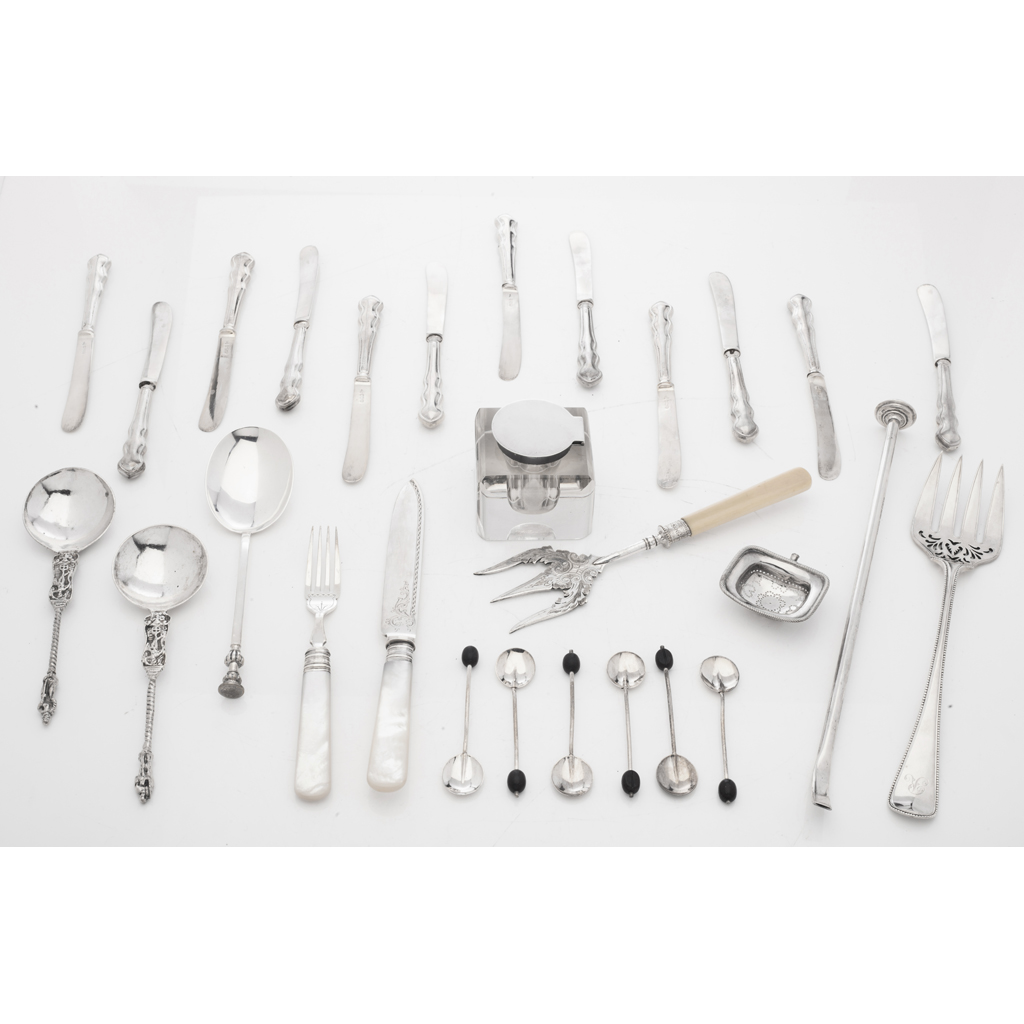 to include; two ornate unmarked Dutch spoons, a seal top spoon, Mappin & Webb, 1923, two serving forks, one three prong, one four; a tea strainer; an ink well; together with, a set of cased coffee bean tea spoons, Adie Brother Ltd, Birmingham 1923; a set of cased tea knives Walker & Hall, Sheffield 1906; a set of cased servers William Hutton & Sons Ltd, Sheffield 1906, a tea macerator, Sampson Mordan & Co, 1864 (11)