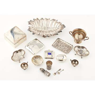 to include a dish shaped as a leaf raised on six ornate feet, a cigarette box , London, of square form; together with a pair of Egyptian silver salts, a vesta case, a twin handled cup, pin box, pin tray, a cigarette case, three unmarked dishes, an Egyptian cup, lead seal (qty)