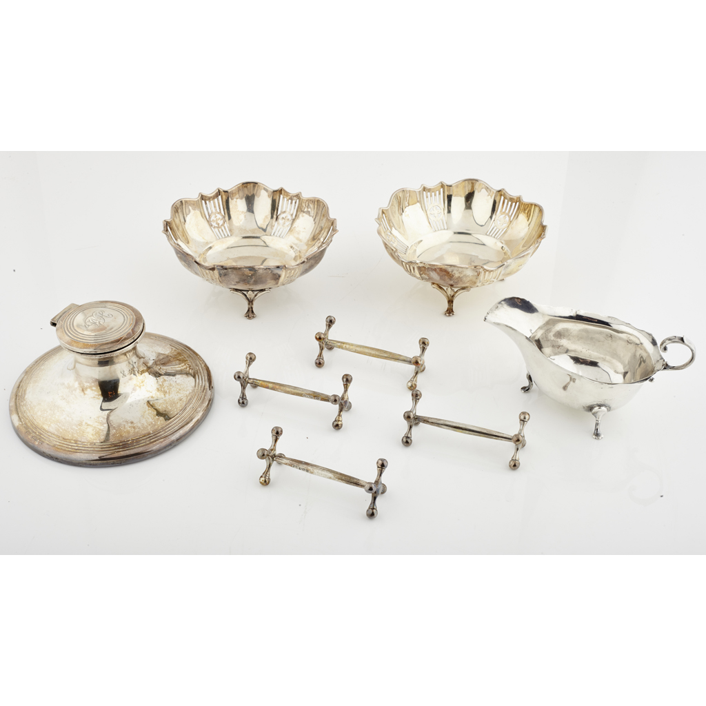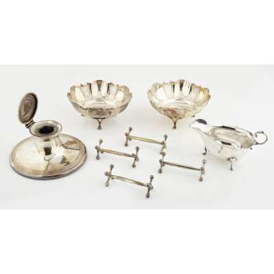 Henry Clifford Davis, Birmingham 1919, in a fitted case, WH engraved to lid; together with, a set of four carver rests, Martin, Hall & Co, Sheffield 1922; a sauce boat, marked for Asprey, indistinct marks; a pair of bon bon dishes, Walker & Hall, Sheffield 1922, in a fitted case (8)